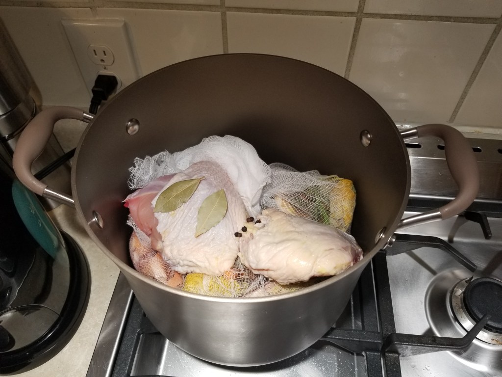 5. Place bundle, chicken, bay leaves, and peppercorns in a large pot.