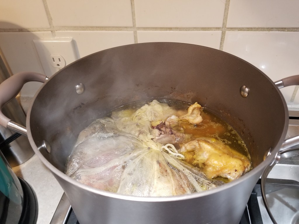 8. Take out stock ingredient bundle, bay leaves, and peppercorns out of pot. Be careful, it will be hot.
