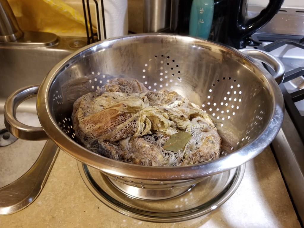 Take out stock ingredient bundle, bay leaves, and peppercorns out of pot. Be careful, it will be hot.