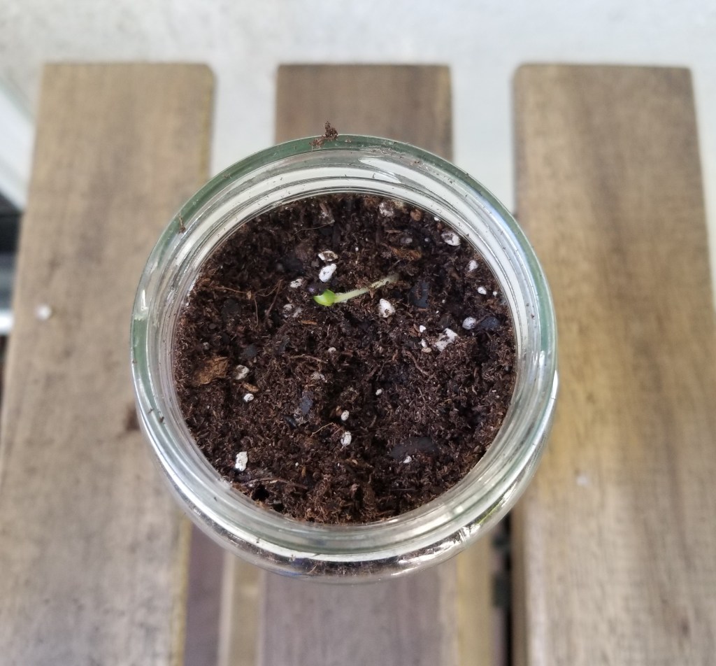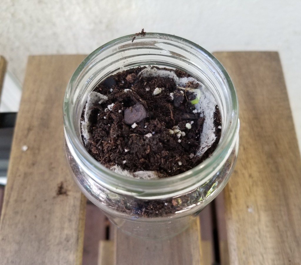5. Gently add more potting soil until the jar is filled all the way. Cover seeds completely. If using seedlings make sure the seedlings are still exposed, but supported with potting soil.