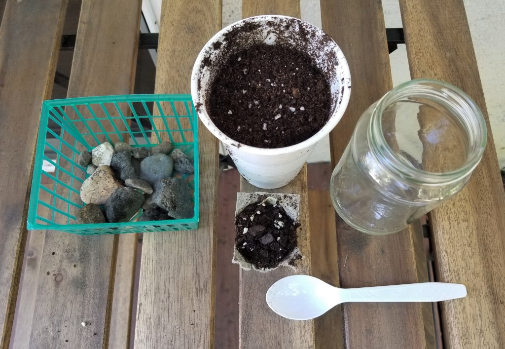 - Collect your tools. You will need an empty jar, rocks or stones, potting soil, a spoon, and herb seeds or freshly sprouted herb seedlings.