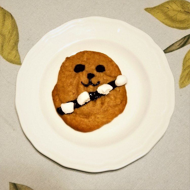 Decoration: melt the chocolate and draw a thick diagonal line on the cookie, this will create Chewbacca’s belt. Add the marshmallows to give the belt details. Lastly, in chocolate, draw an adorable Wookie face!