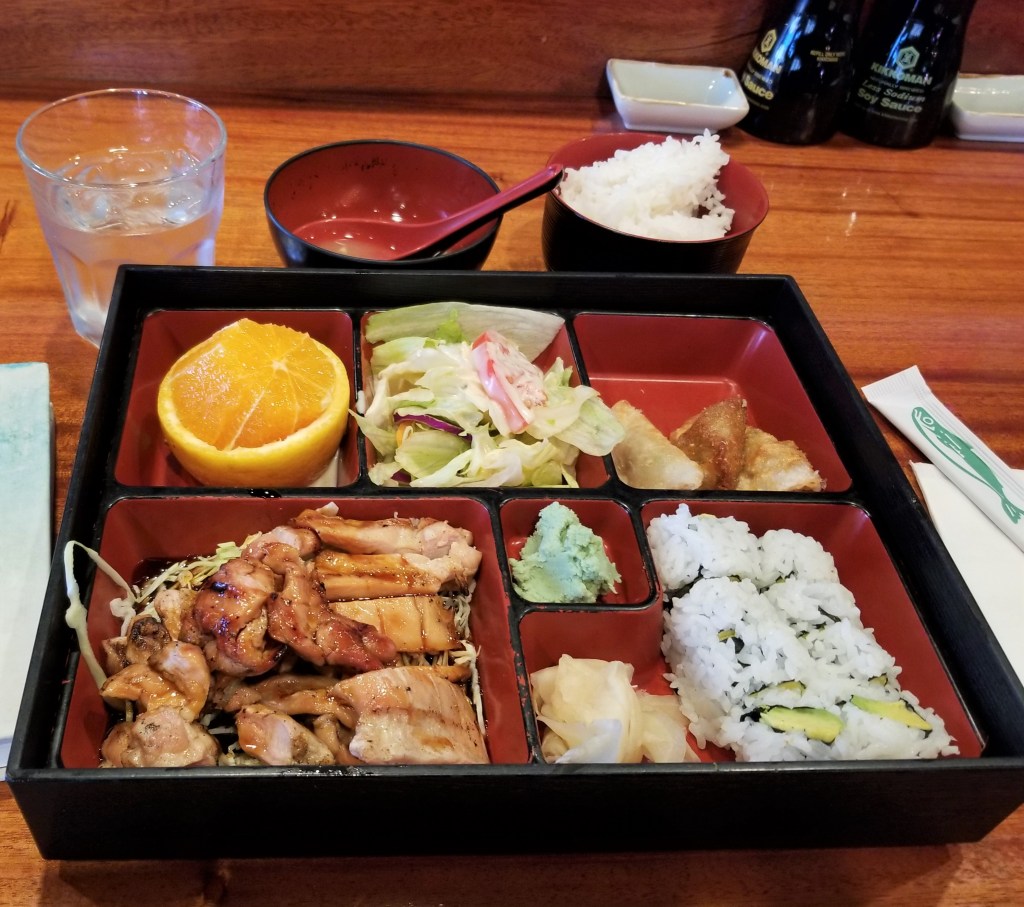During another visit I decided to give their lunch bento box a try. I ordered the Chicken Teriyaki and a California roll. It was dark meat chicken slathered in a lovely teriyaki sauce that had just enough sweetness to it. The bento box came with salad, miso soup, gyoza dumplings, and white rice. It was very filling and delicious!