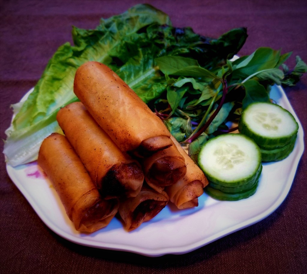 Eating and making spring rolls always takes me back to childhood. My father, cousins, aunts, uncles, and I would sit down together at a table covered with spring roll wrappers, pork filling, and little bowls of water. We would sit and wrap dozens of rolls together for large family parties. It would bring us closer together because we would laugh and talk about what was going on in our lives. One of my best more recent memories of spring rolls was a few years ago when my husband and I were still dating. It was around the holidays and he had not met most of my extended family yet. We arrived at their house and were greeted enthusiastically by my family members. Not long after we had arrived, one of my distant relatives, an older woman we always called “Auntie”, had led my boyfriend to the table and started to have him wrap spring rolls without saying a word. I thought it was sweet and in our own special way it showed that he was already part of the family. I hope this recipe brings you joy and brings your family closer together!