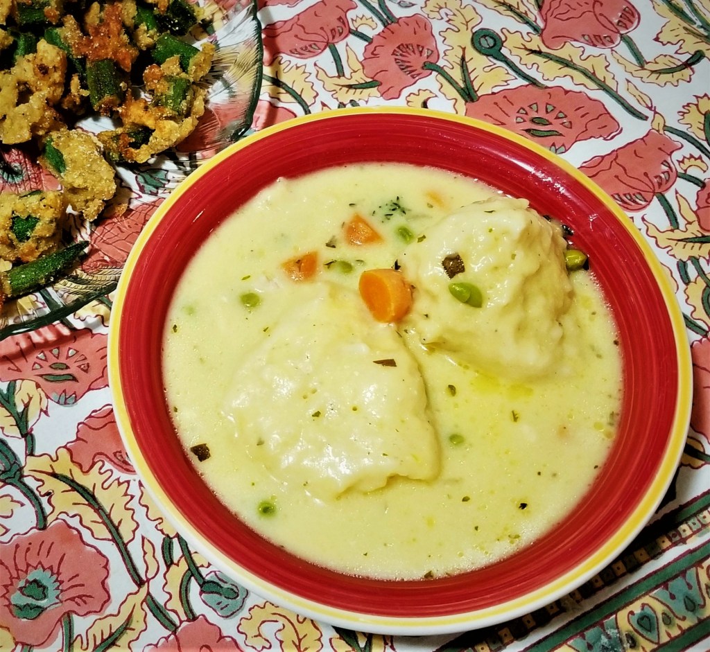 Chicken and dumplings has always been near and dear to my heart. I have always found the dish so warm and comforting. My first time eating chicken and dumplings was on a beach trip with my friend when I was around 14 years old. We were heading home on our way back from the beach and her mom and aunt wanted to have lunch at Cracker Barrel. After we had passed by all the adorable toys and kitchenware in the gift shop we were escorted to our table. I read the menu and was curious about the chicken and dumplings dish, so I ordered it. The plate put in front of me had chicken, flat noodle like dumplings, and was prepared almost like a stew. I took my first bite and I thought it was fantastic. It was soup was rich and creamy. The chicken was succulent and the dumplings were flavorful.