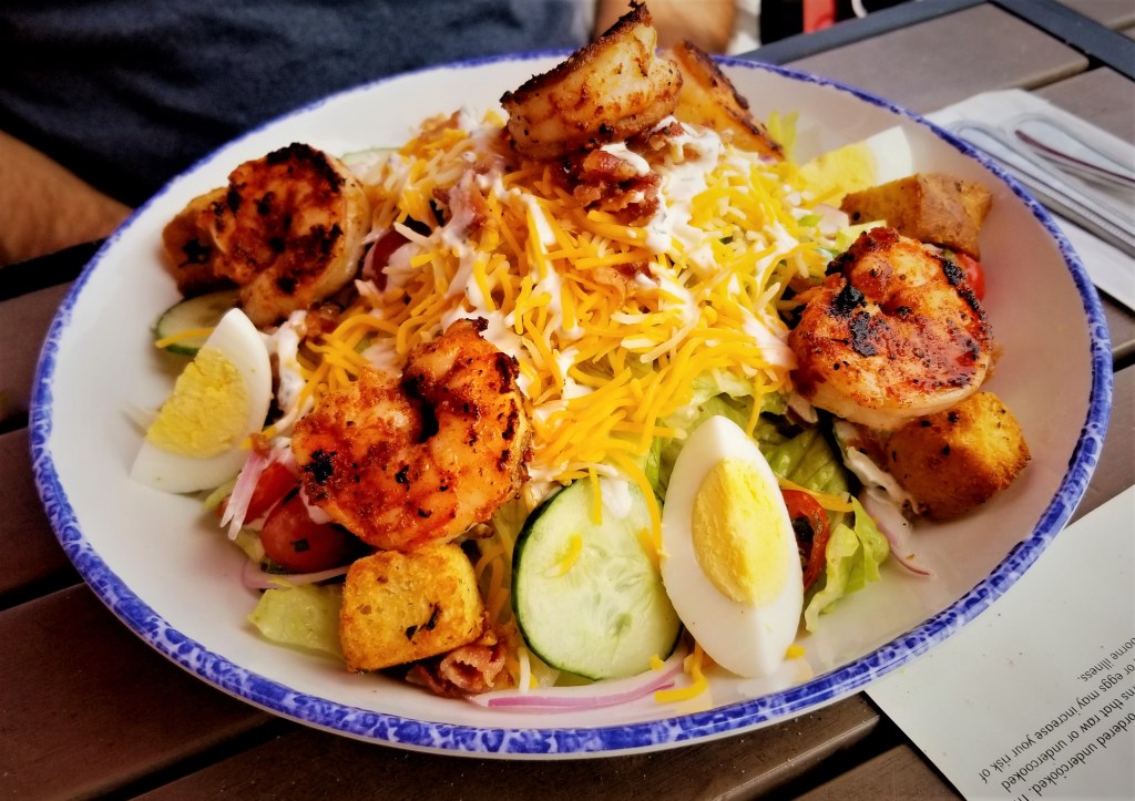 At the suggestion of our server, my husband ordered Vola’s Chopped Salad and he asked for shrimp on top. The salad consisted of iceberg lettuce, romaine lettuce, cucumbers, grape tomatoes, red onions, apple wood smoked bacon, a hard boiled egg, cheddar, and garlic croutons. The salad was dressed with both honey mustard and ranch dressing. The lettuce was crisp. All the toppings were well prepared. The dressings made the salad taste both cool and tangy. The added grilled shrimp was well seasoned and gave the salad an upscale vibe.