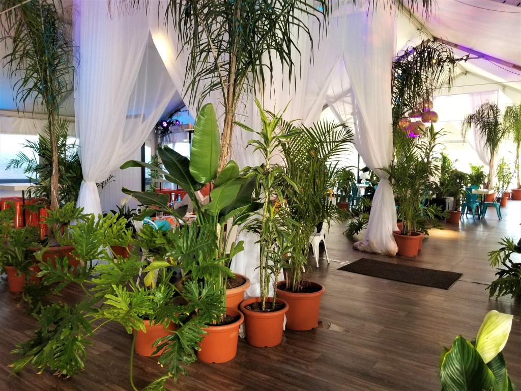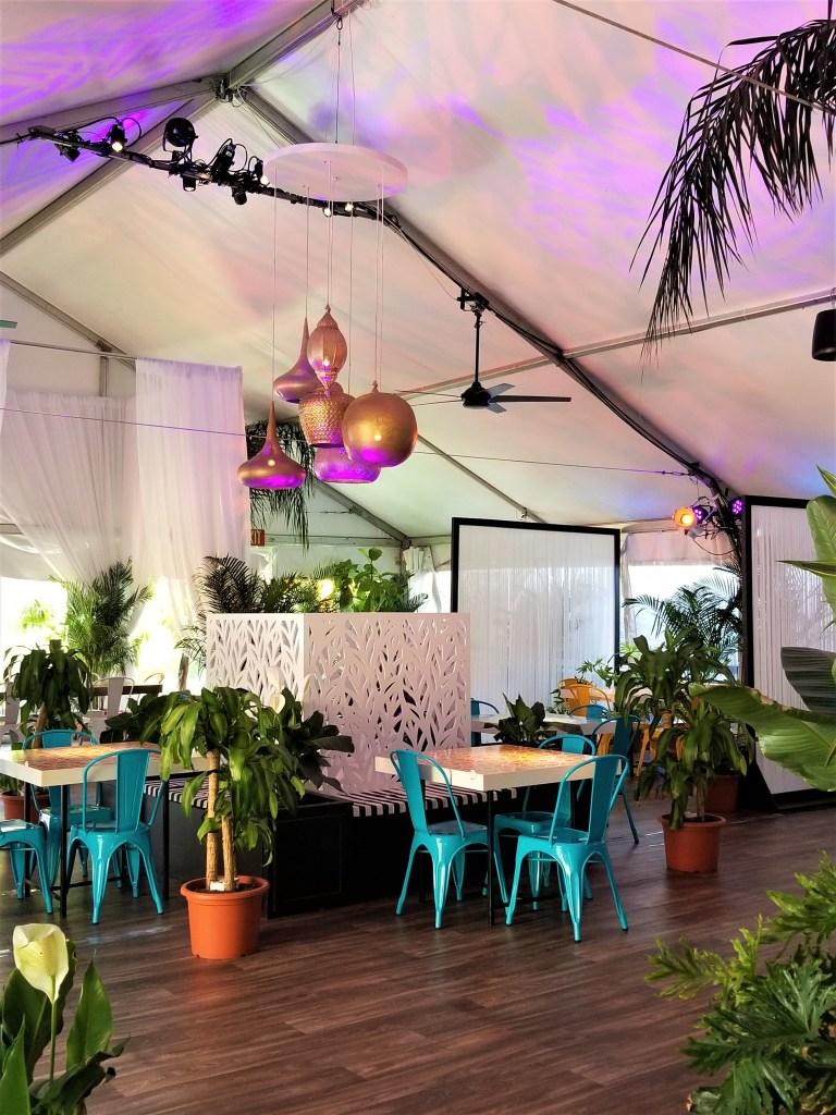 Lena’s Oasis is an influencer’s photographic dream. Just to the left of the entrance is a New Hollywood Style foliage wall to take photos with friends and family. People could be illuminated by lights of the bright yellow “Ciao Bella” sign. The main structure was a white tent with a white billowy canopy. There was purple and blue underlighting and gold lamp chandeliers to create ambience. Each table had beautiful orange and green Spanish tile design on top. Patrons could sit at brilliant turquoise and canary yellow metal seats. There were all kinds of plants of different shapes and sizes surrounding each table to create a real oasis effect.