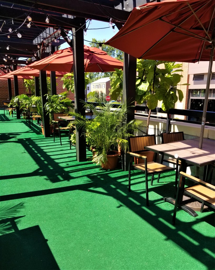 There was also outside deck seating drowned in sunshine and twinkly lights. The floor was covered in bright green turf and there were more potted plants everywhere. The outdoor tables and chairs were all teak colored. Each table had a red umbrella for patrons to also have shade. It had a different vibe from the canopy seating, but it was all very fun.