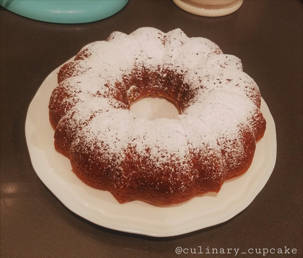 I thought a Bundt pan would be the most appropriate looking pan for donut cake because of its rounded shape and hole in the middle, like most donuts. Though this recipe works well with a standard 8×8 inch square cake pan too. After some experimentation with cake batter and spices I created a donut cake to my satisfaction. When my husband tried it he loved it, and the flavor reminded him of a cake donut. I hope that this recipe brings your friends and family pleasure. Please enjoy!